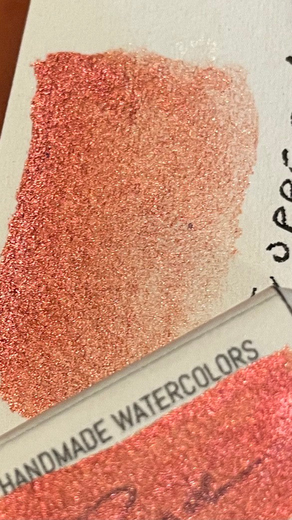 Beautiful red copper with metallic effect. Extra fine mica particles give this paint a very smooth shiny look. Excellent for white, toned and black paper.